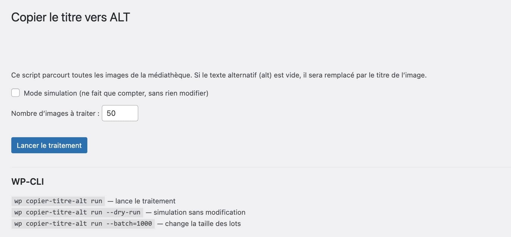 Après activation du plugin, ouvrez l’outil depuis l’administration WordPress : Outils → Copier le titre vers ALT.